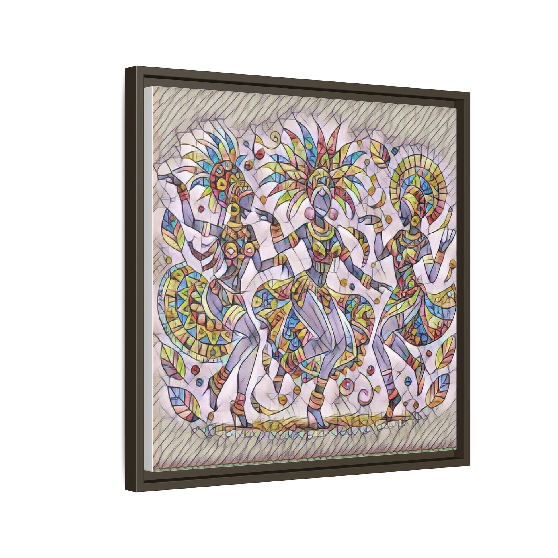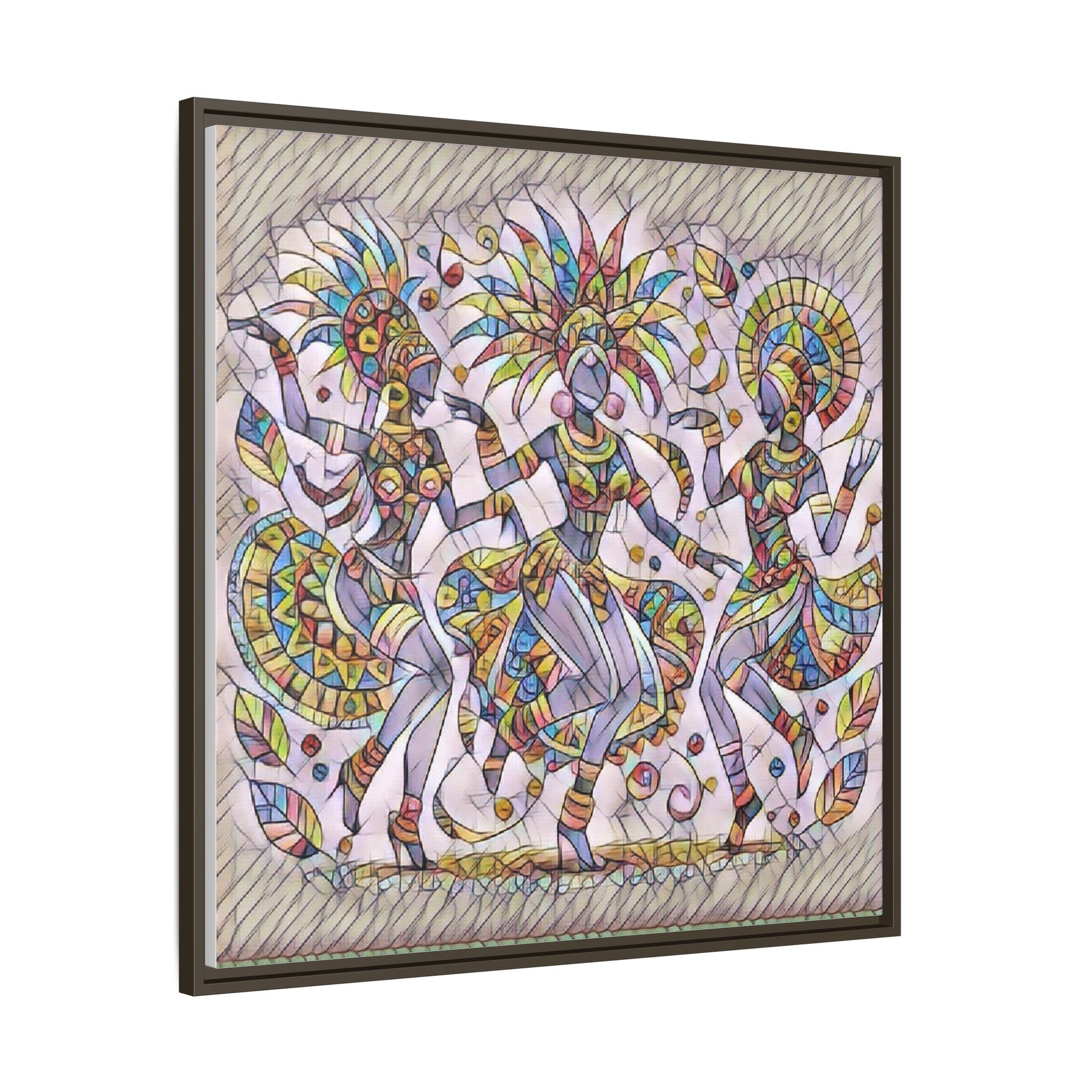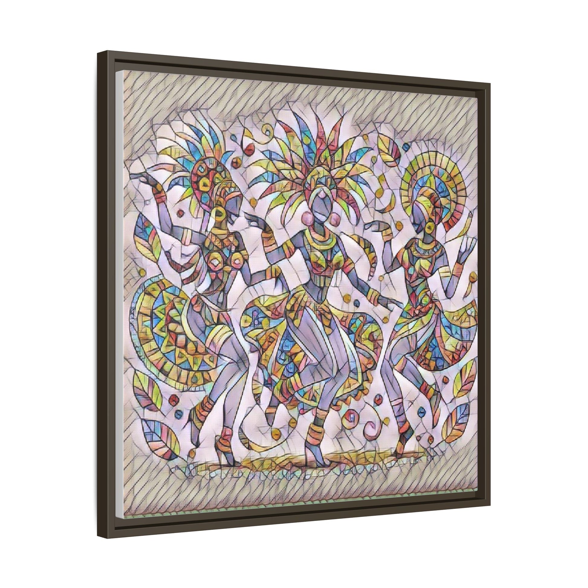 Colorful Carnival Dancers Framed Canvas Art — Multicolor Tribal Celebration Print