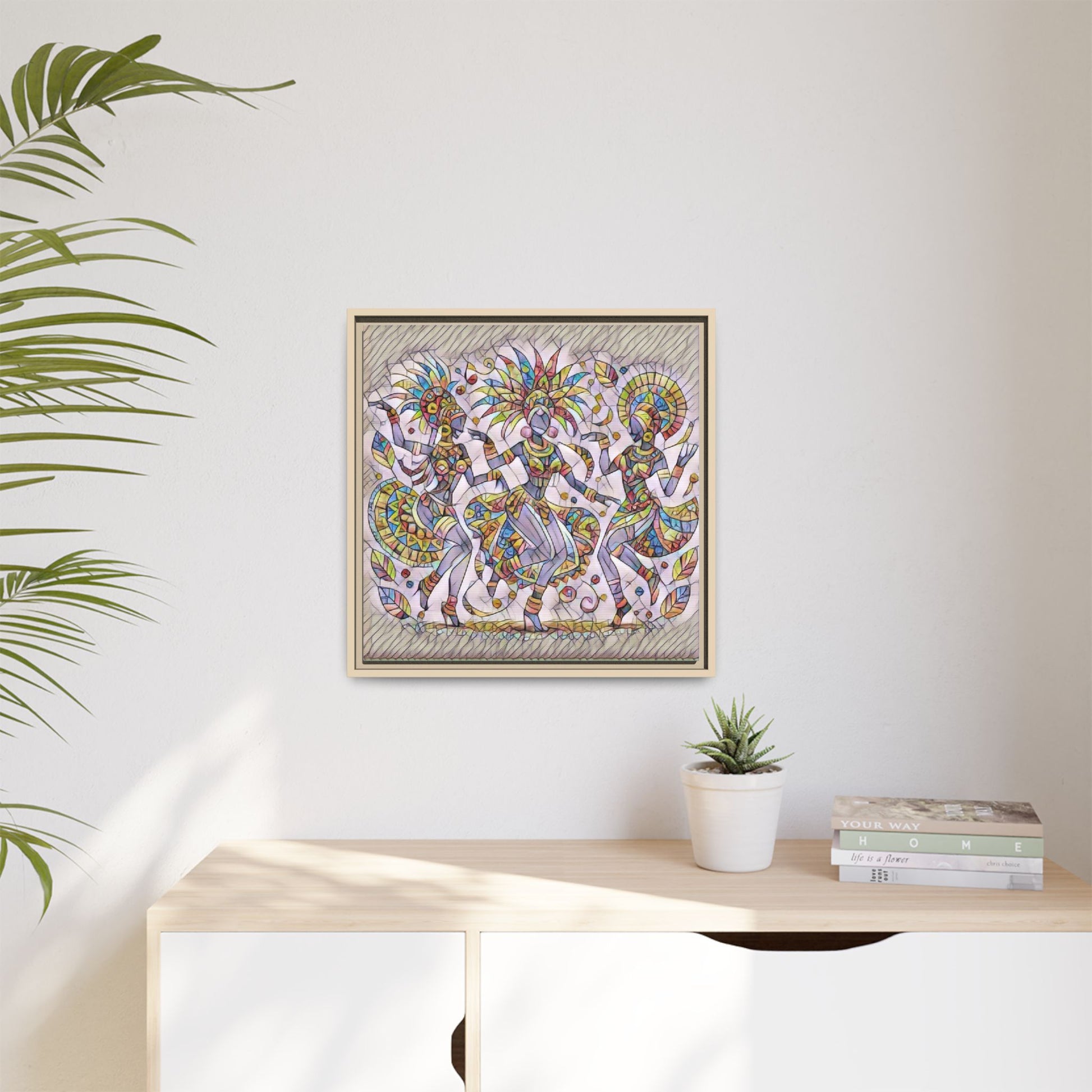 This framed matte canvas brings vibrant, rhythmic energy to any wall. Hand-drawn lines and jewel-tone colors swirl into a celebratory scene—figures caught mid-dance, patterned headdresses, and leaf-like motifs that echo movement. The fine matte finish tames glare and highlights the layered textures in the artwork, while the slim pine frame gives a clean, gallery-ready edge. Hang it in a living room, studio, or hallway to introduce warmth, storytelling, and a touch of handcrafted spirit to your space.