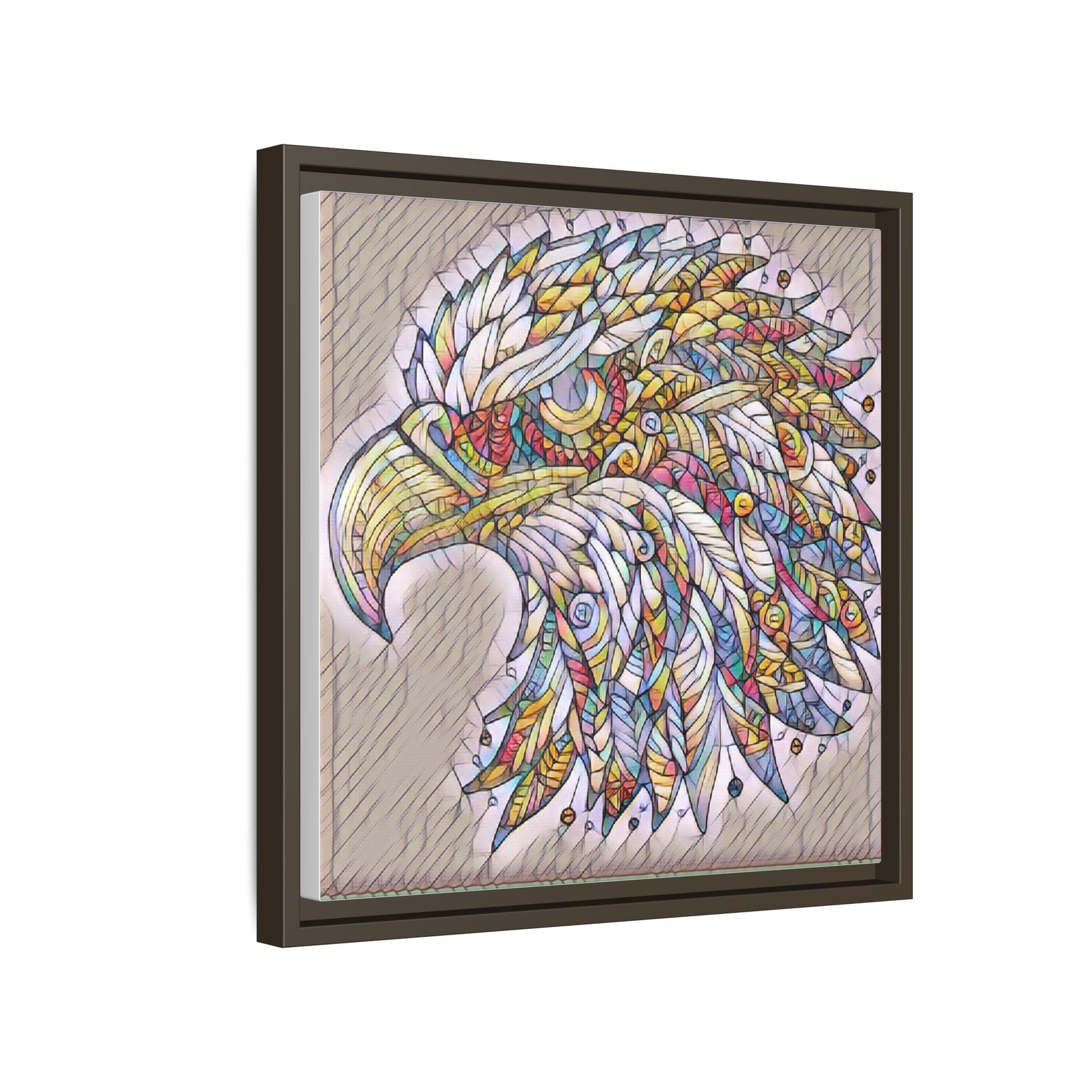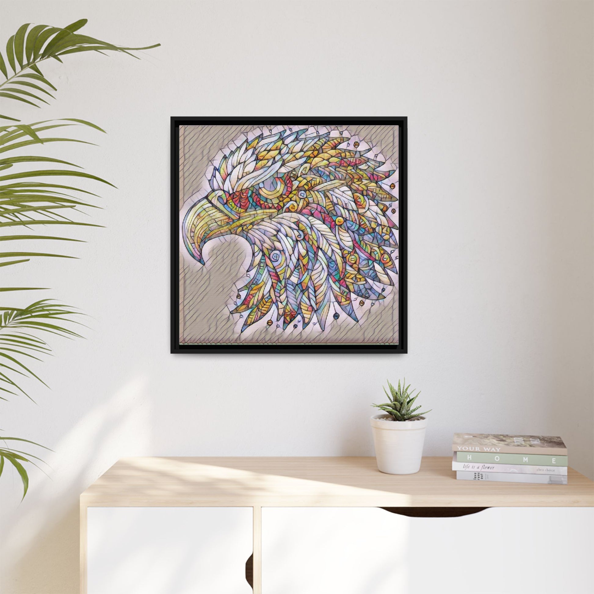 Hand-stretched matte canvas with a slim pine frame brings this intricately patterned eagle to life. Soft, textured tones and vivid accent colors sit on a warm neutral ground, giving the piece a handcrafted, gallery-ready presence. Hang it in a living room, workspace, or entryway to add layered detail and quiet energy—a visual conversation starter that feels both modern and artisanal.