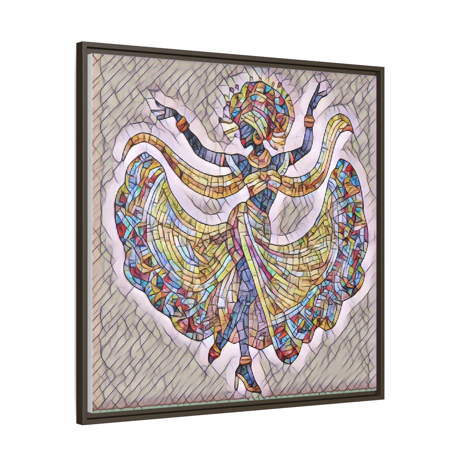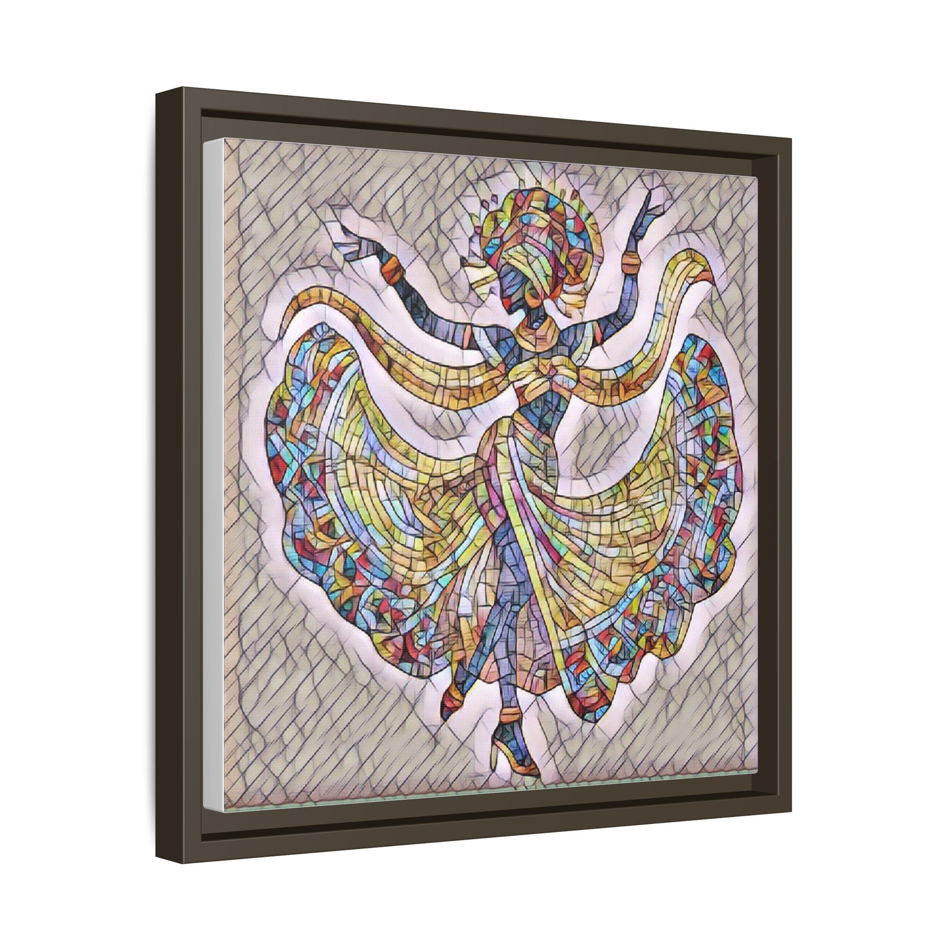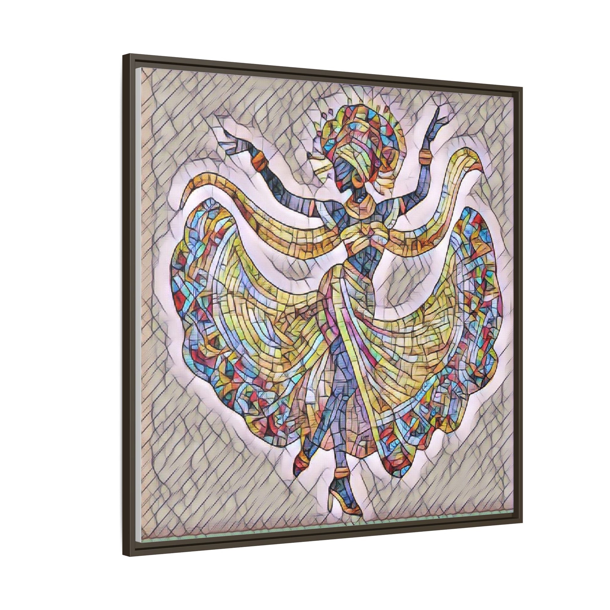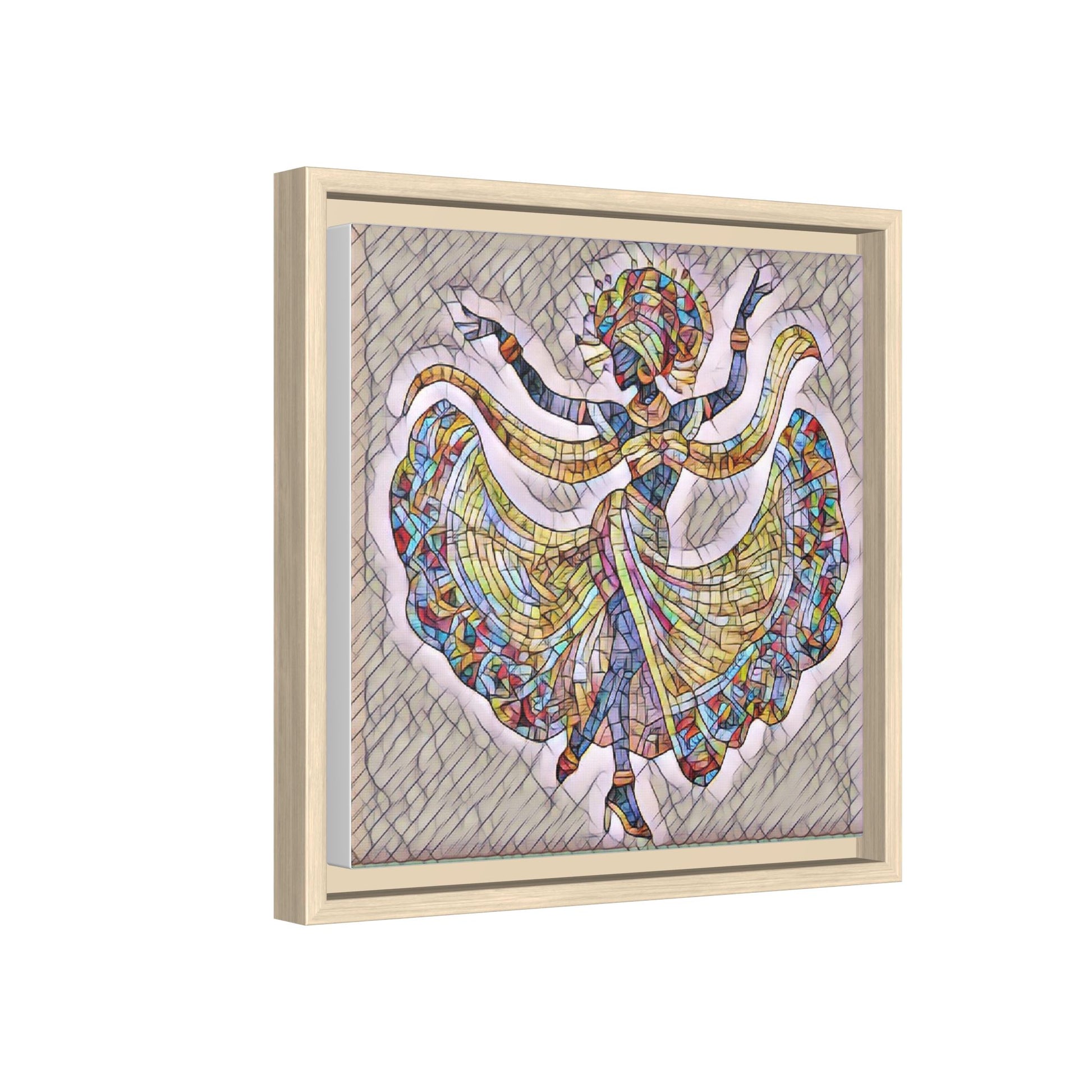 A vibrant framed matte canvas that brings movement and color into a living space. This piece features a dancer rendered in a mosaic-like, stained-glass style—bright shards of color flow through the skirt and ribbons, set against a soft, textured neutral background. The thin pine float frame in your choice of finishes adds a modern gallery feel while keeping the artwork the focus. Hang it in a hallway, above a mantel, or in a creative studio to invite energy, rhythm, and a handcrafted-artisanal look into the room.