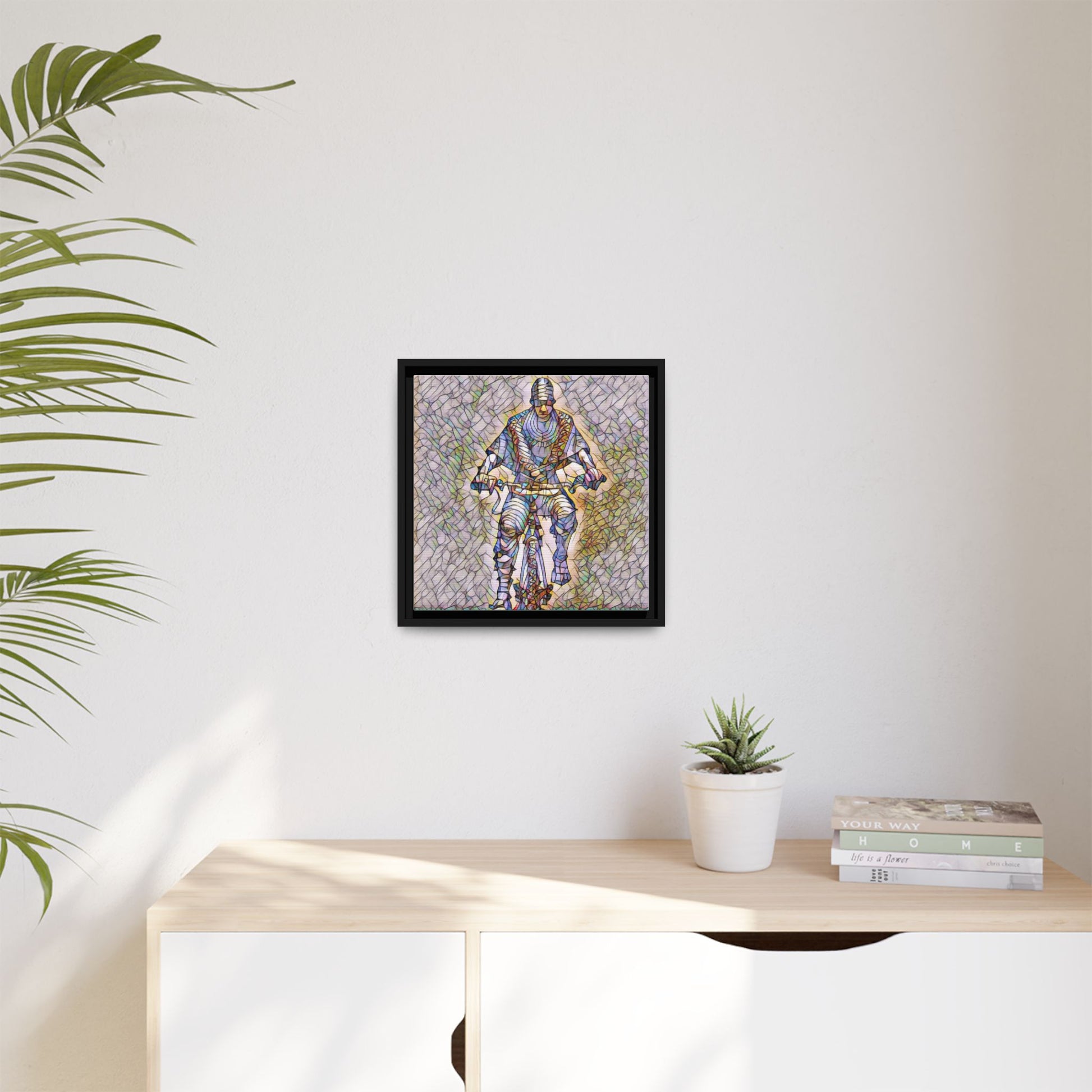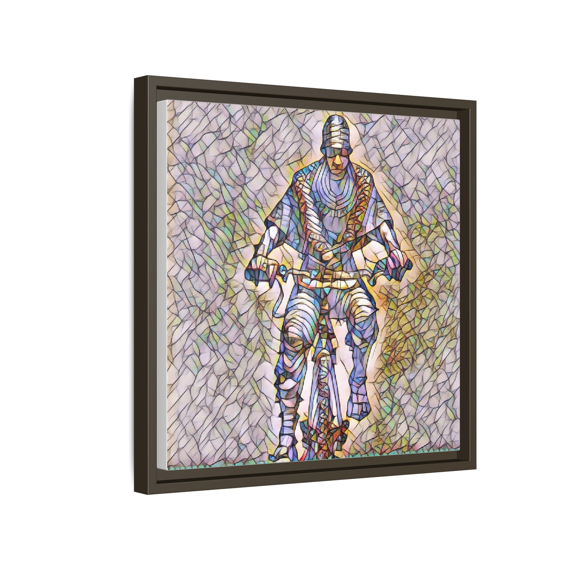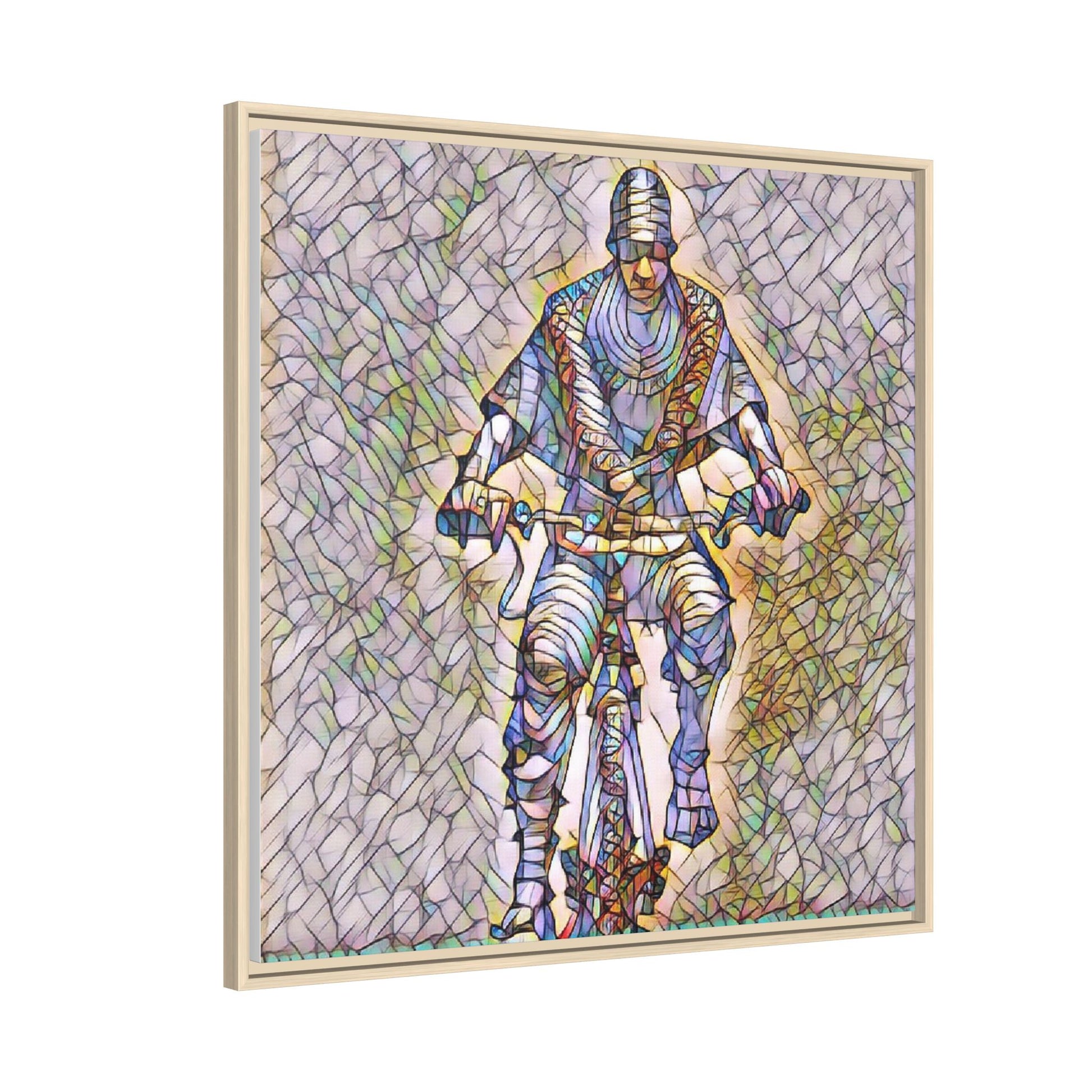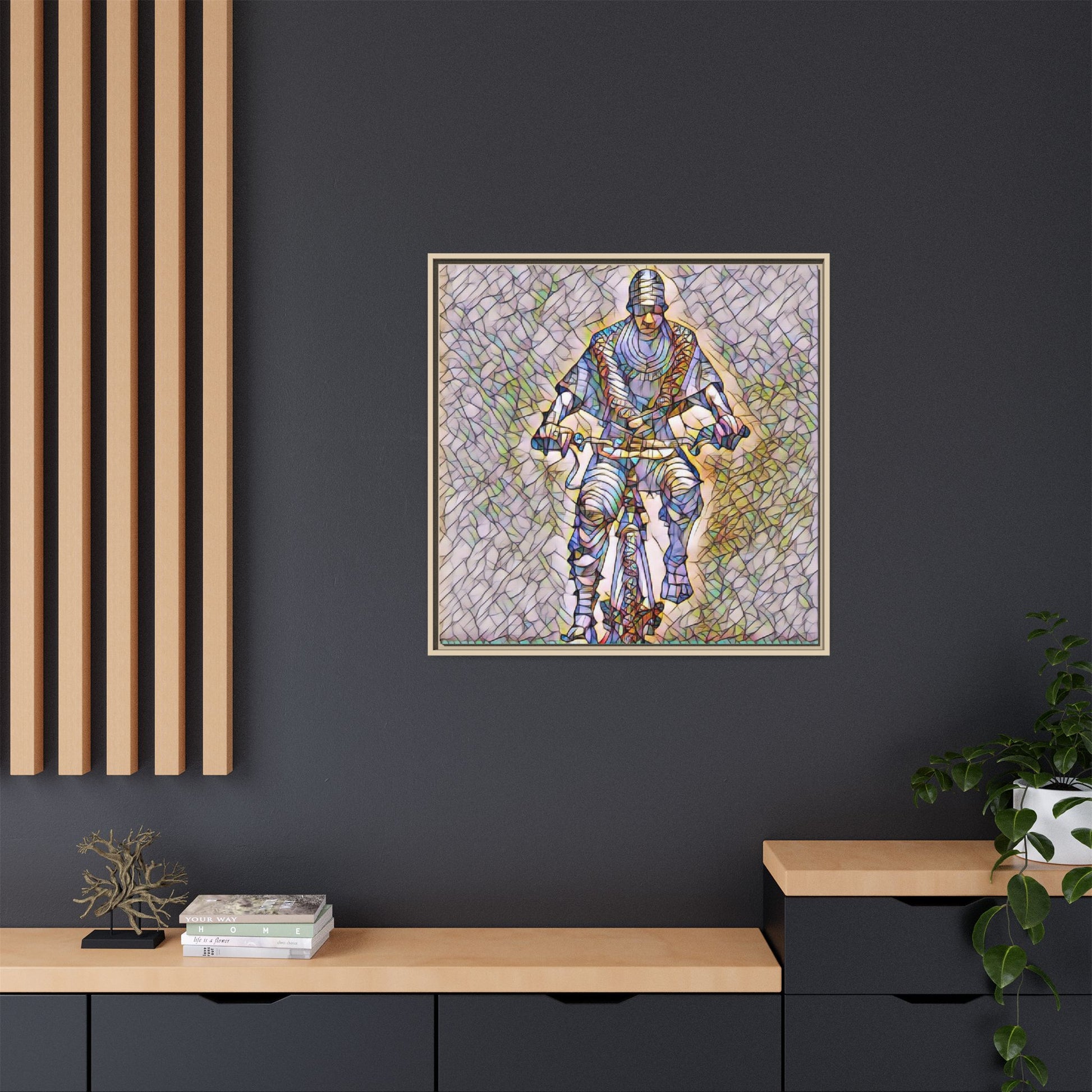 This framed matte canvas captures motion and character with painterly, stained-glass textures. The image of a cyclist rendered in layered color and line brings energy to a hallway, studio, or living room — as if the figure is still pedaling through light. The black pine frame adds a refined border that makes the artwork read like a window into movement. Sustainably produced and printed with Greenguard Gold-certified, non-toxic latex inks, this piece blends gallery-quality color with everyday livability. Hang it vertically or squarely to anchor a modern interior or a sporty, creative nook.