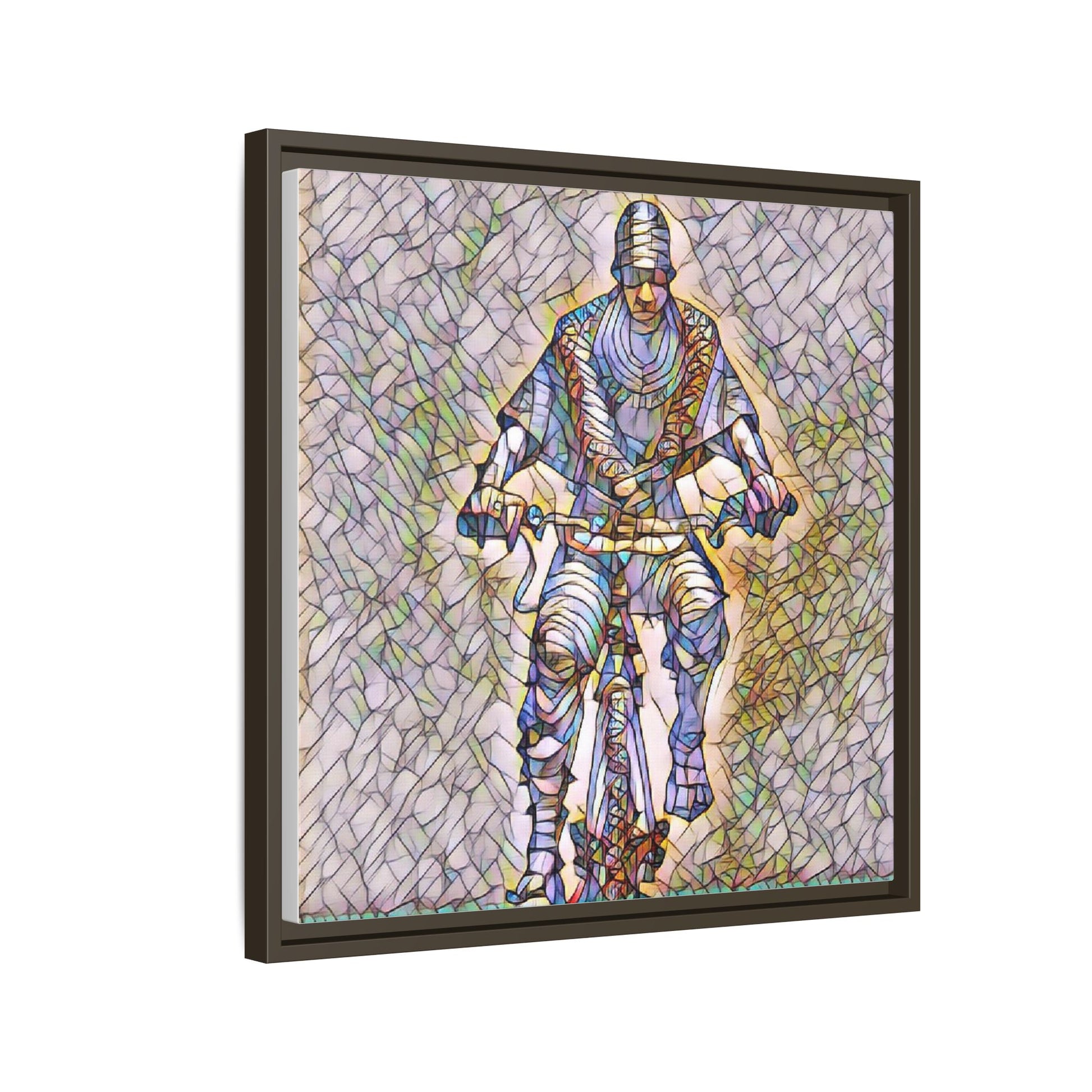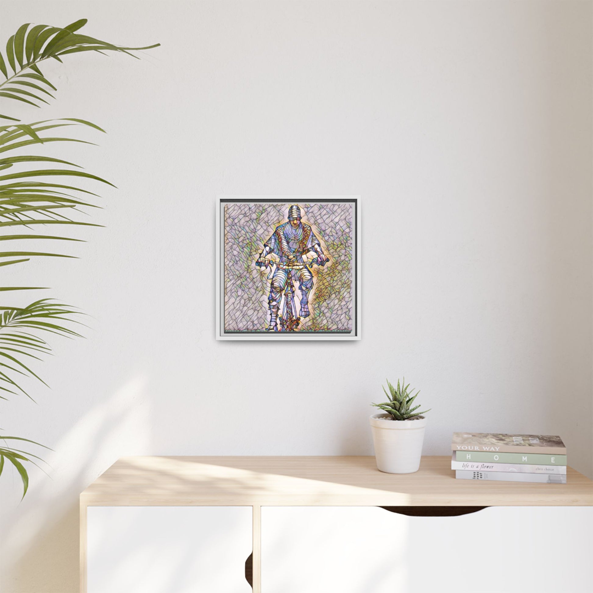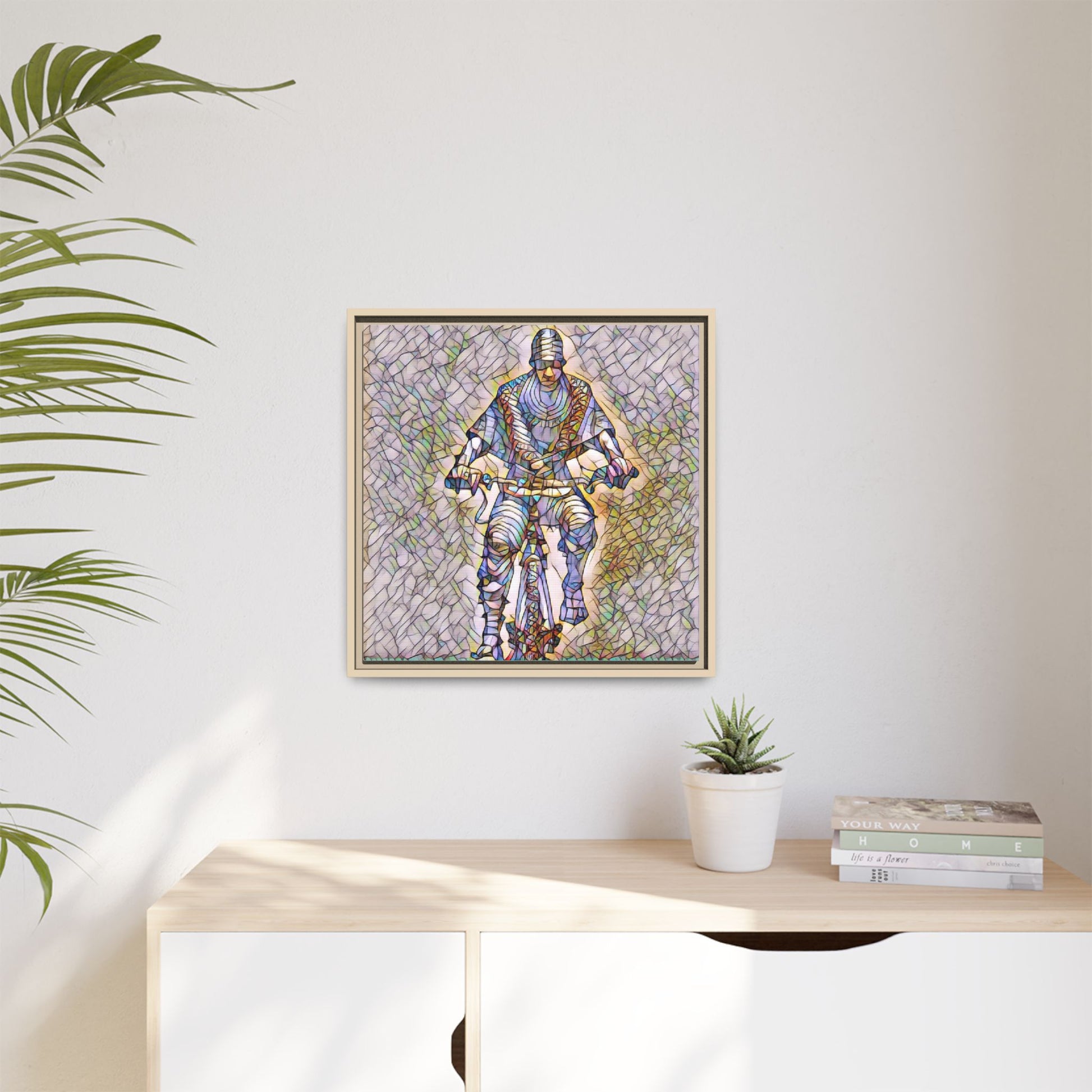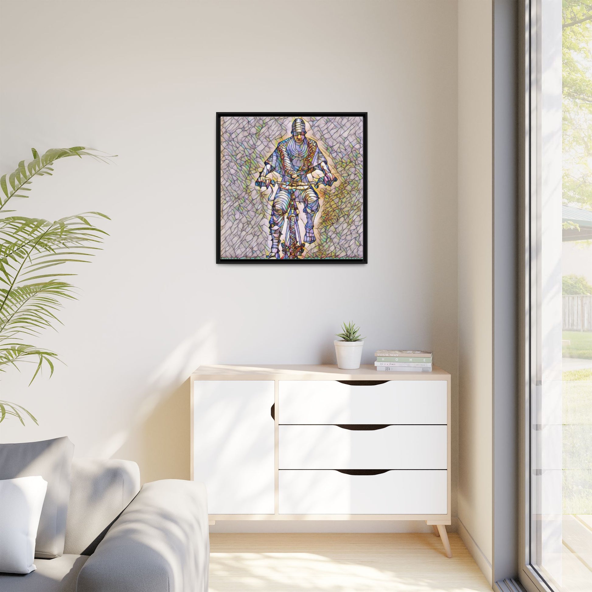 This framed matte canvas captures motion and character with painterly, stained-glass textures. The image of a cyclist rendered in layered color and line brings energy to a hallway, studio, or living room — as if the figure is still pedaling through light. The black pine frame adds a refined border that makes the artwork read like a window into movement. Sustainably produced and printed with Greenguard Gold-certified, non-toxic latex inks, this piece blends gallery-quality color with everyday livability. Hang it vertically or squarely to anchor a modern interior or a sporty, creative nook.